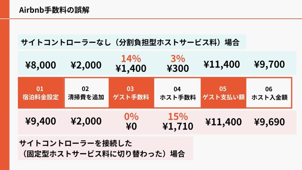 このことから、「Airbnbの手数料が跳ね上がる」と感じられる方もいらっしゃいますが、実際そうはなりません。