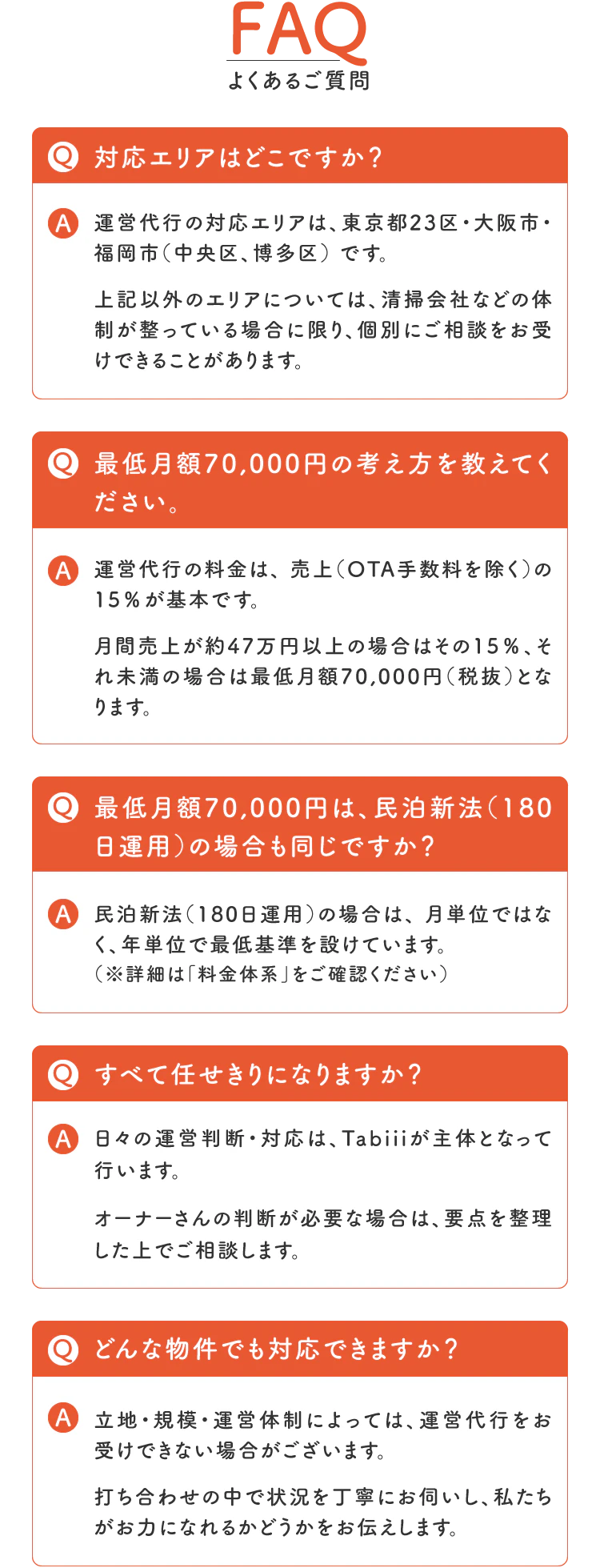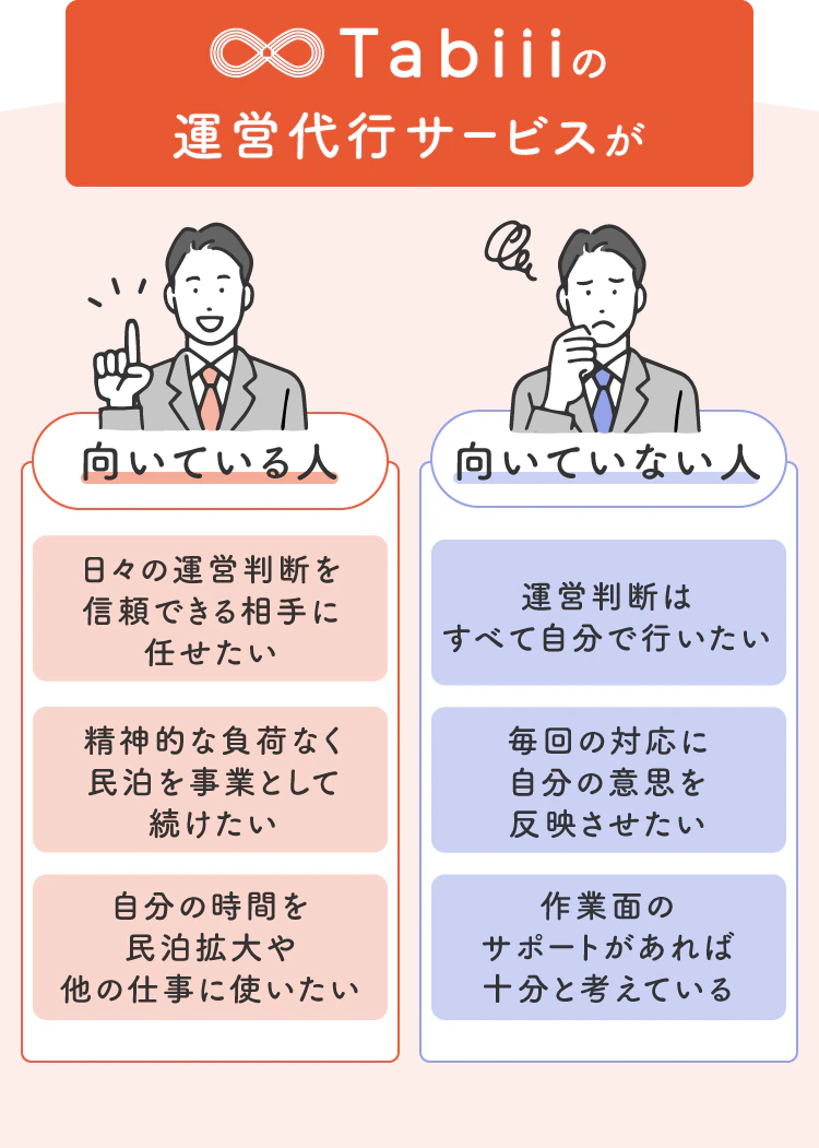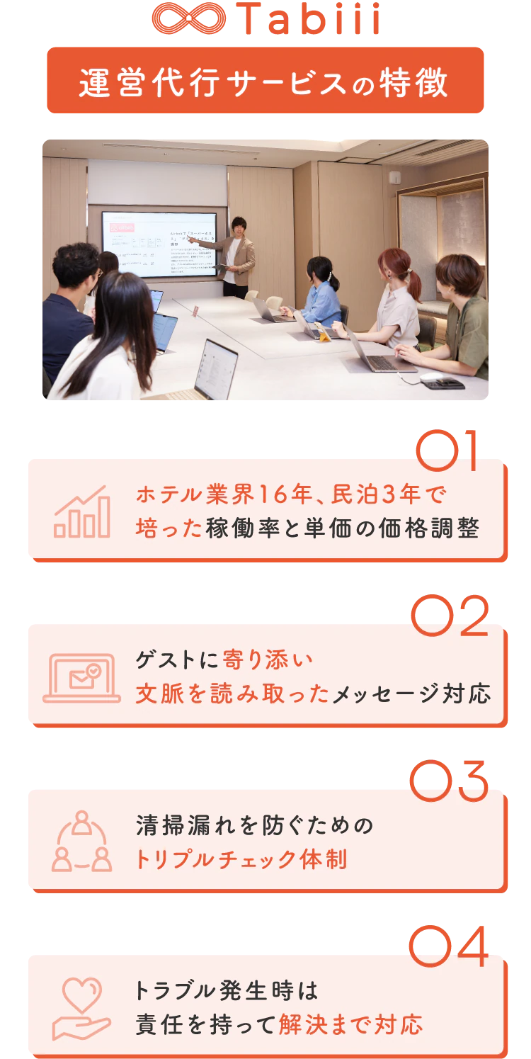 Tabiiの運営代行は、「民泊運営の意思決定を引き受けます。」「オーナーさんの負担を最小限にします。」